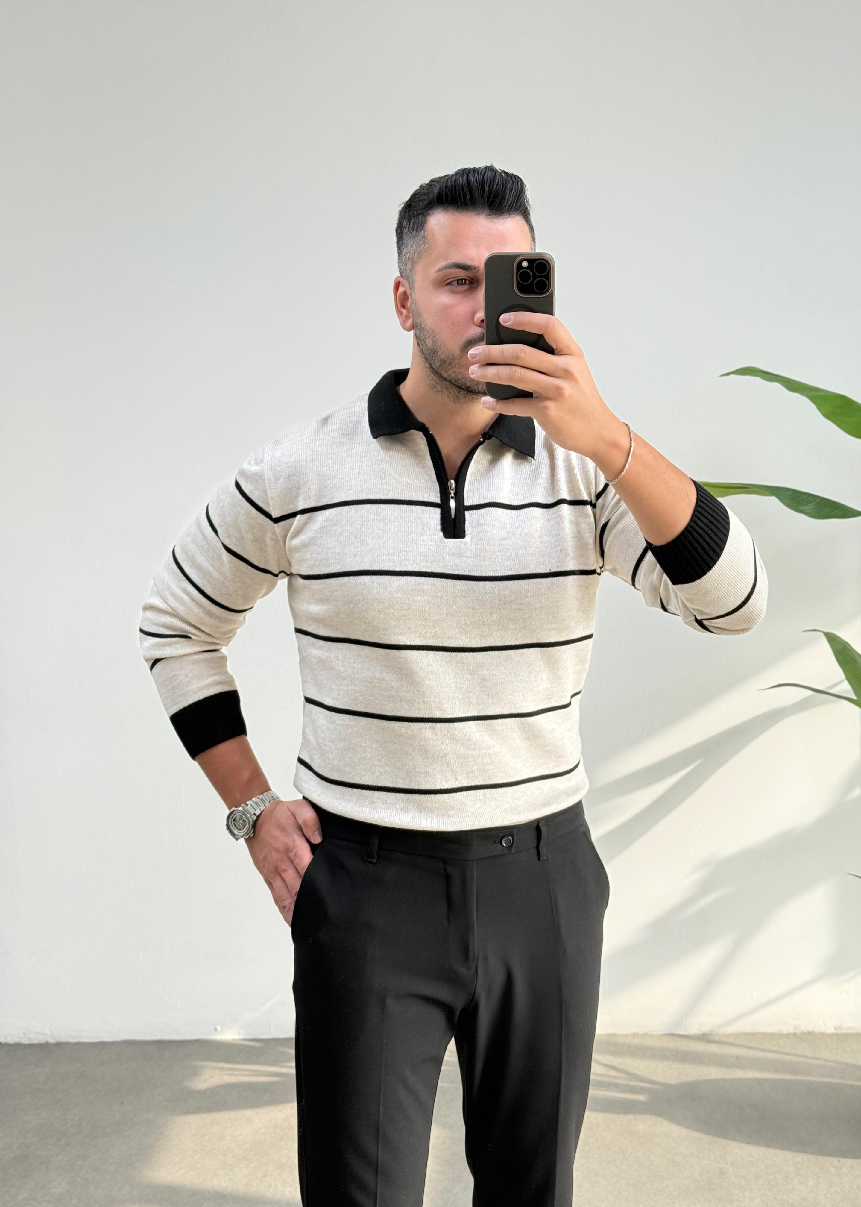 Art Krem Çizgili Fermuarlı Kazak (3570J)
