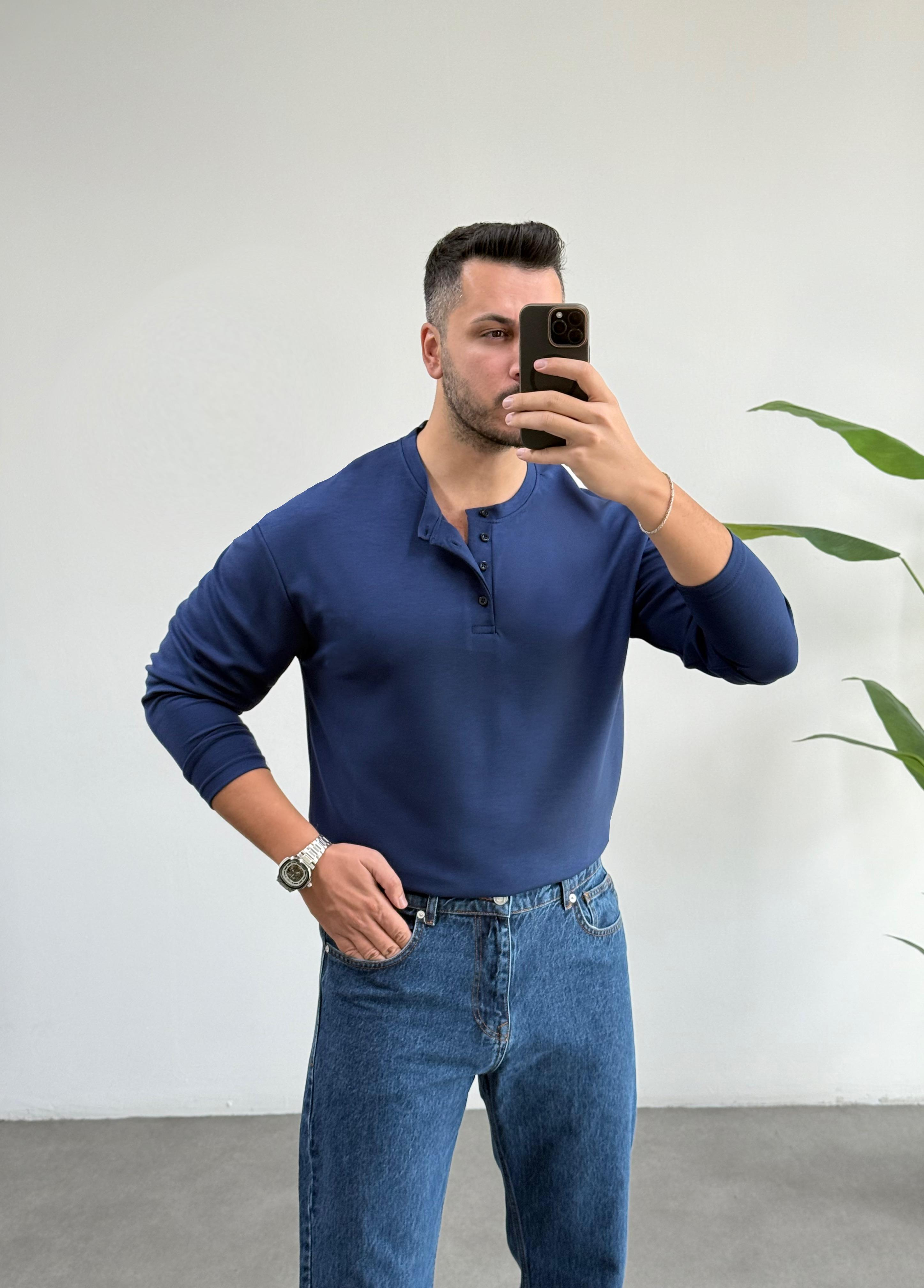 Dokulu Oysho Yaka Düğmeli Lacivert Sweat (3580J)
