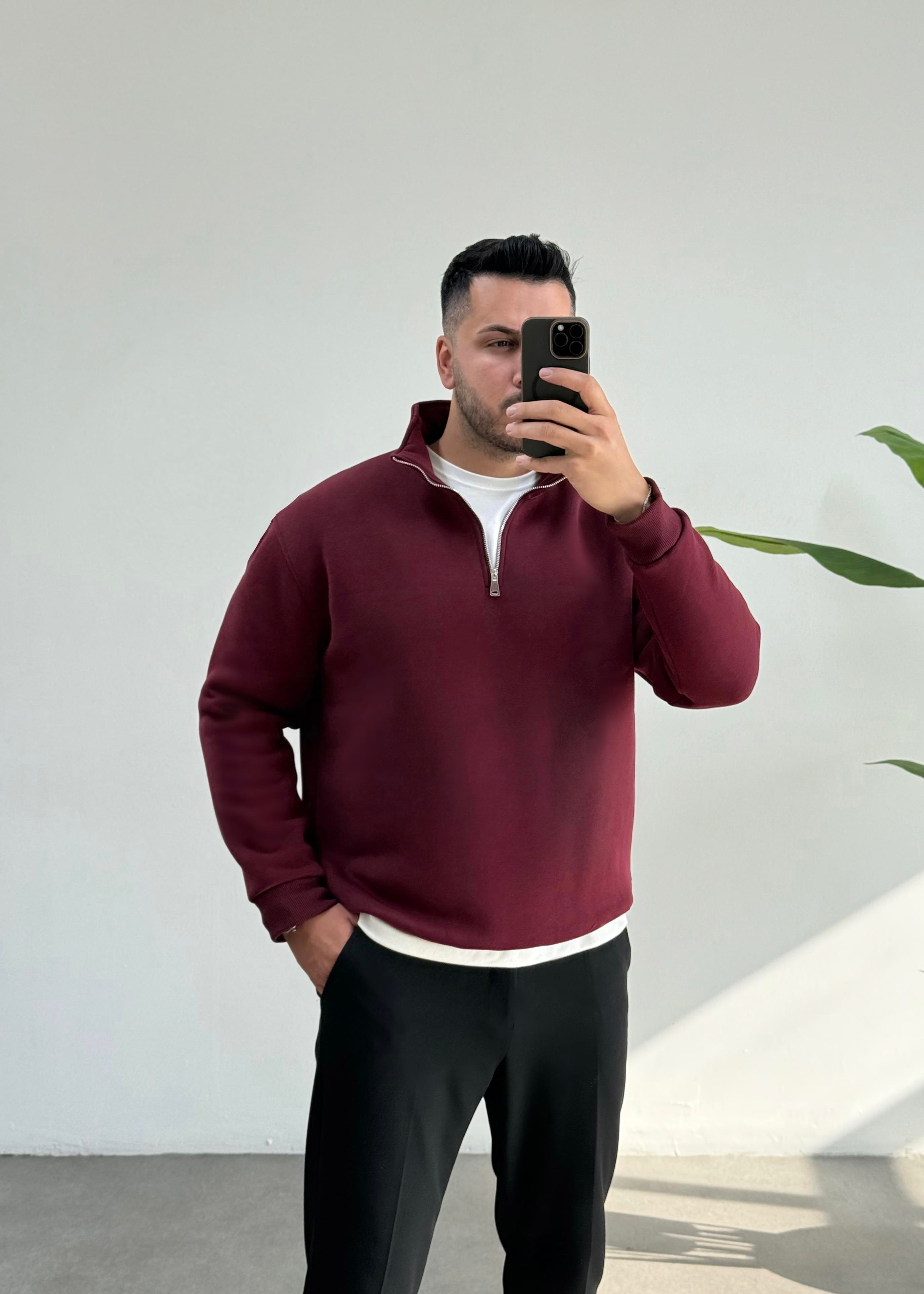 Şardonlu Yarım Fermuarlı Bordo Sweatshirt