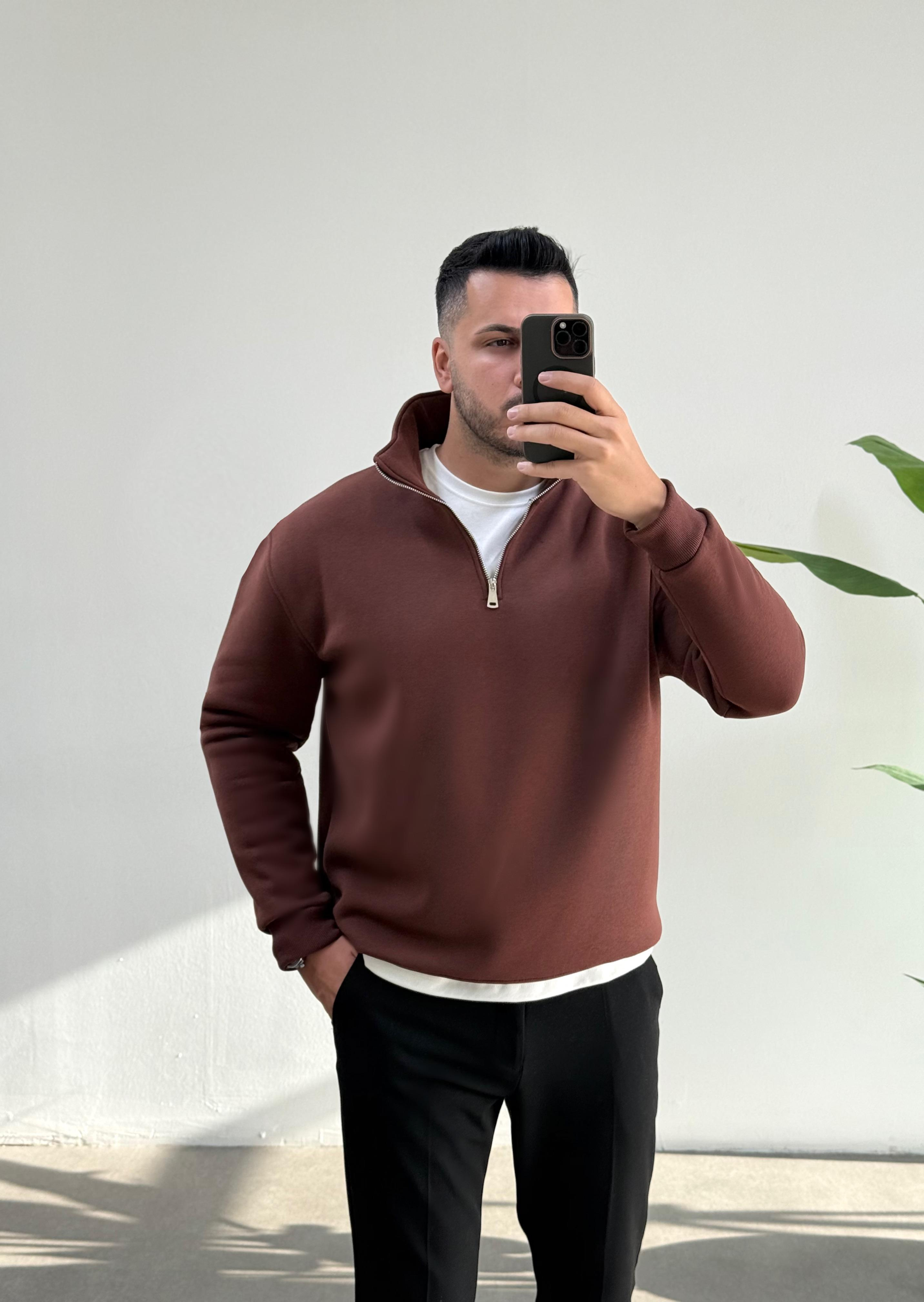 Şardonlu Yarım Fermuarlı Kahve Sweatshirt