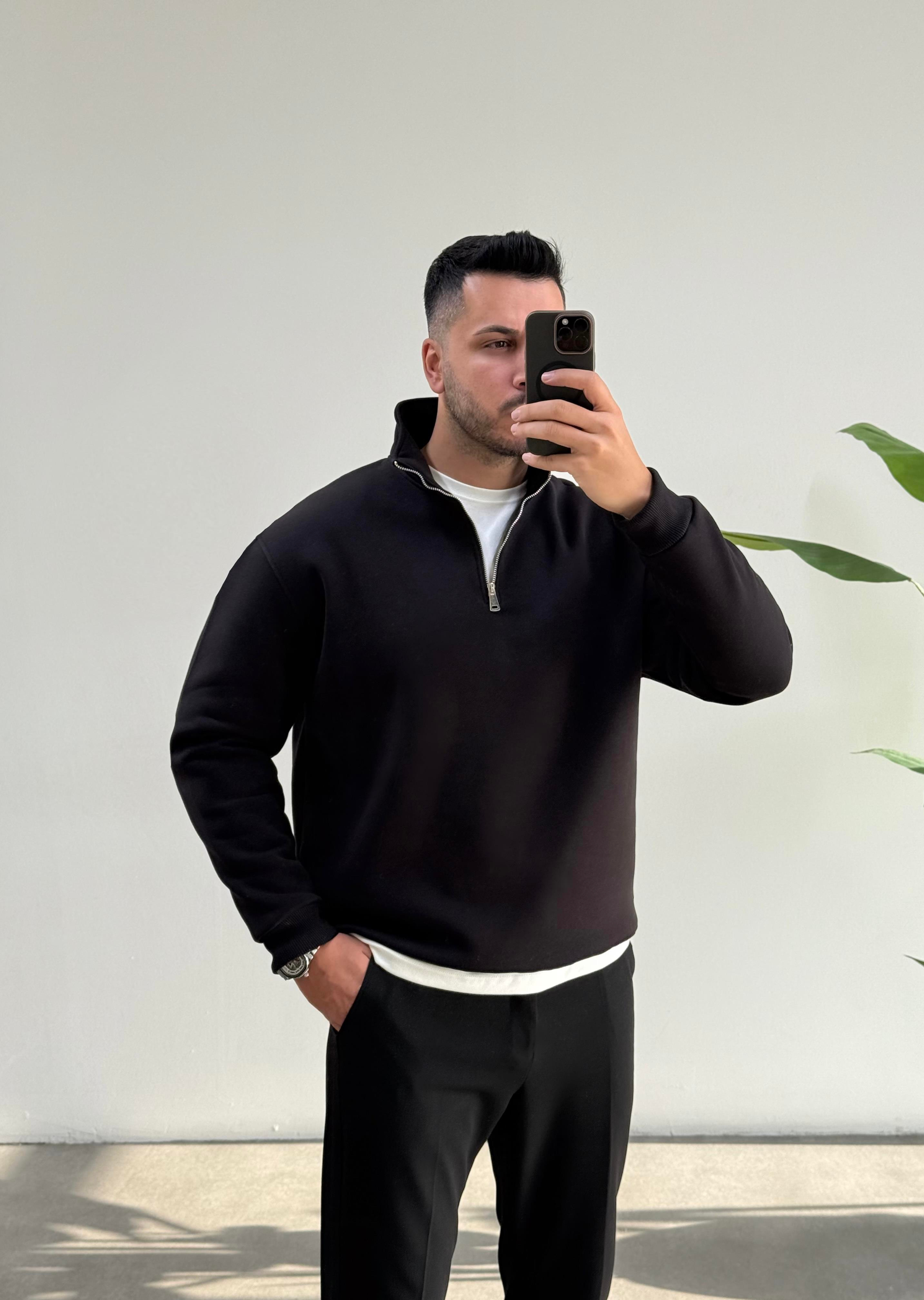 Şardonlu Yarım Fermuarlı Siyah Sweatshirt